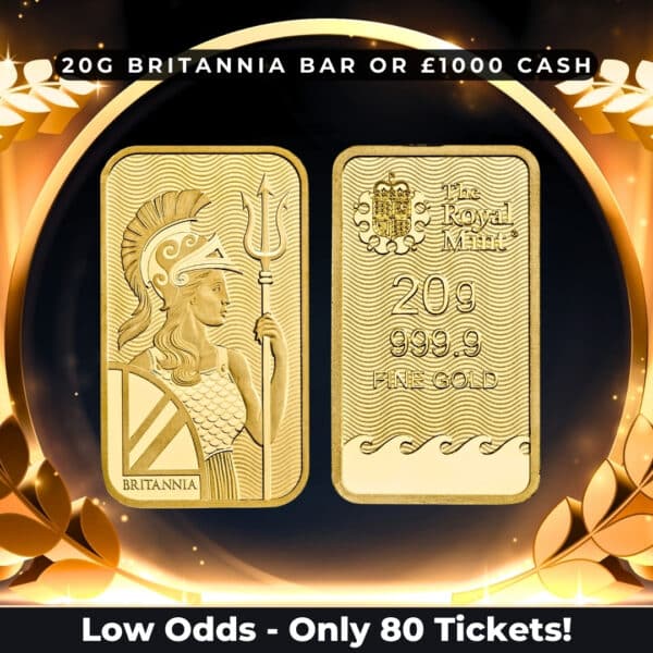 In this Sunday’s LOW ODDS Competition you have the opportunity to win this incredible 2024 Britannia 20g Minted Gold Bar or £1000 Cash! Being Low Odds Means there is only 80 Tickets Available!  Tune into our Facebook page live at 7pm to see if you are our lucky winner – Good luck! 🧡💙