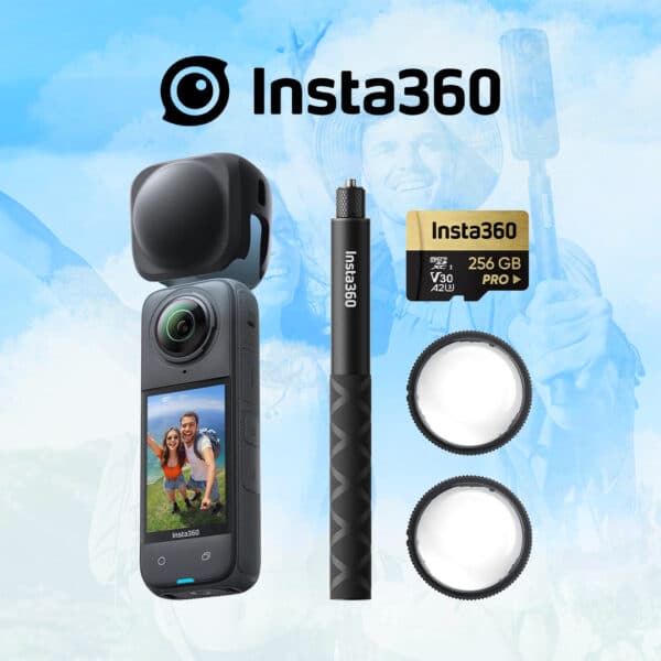 Complete with Everything you need to get started. In this package there is: The Insta 360 X4, 1x Standard Lens Guards, 1x 114cm Invisible Selfie Stick, 1x Lens Cap and 1x 256GB microSD card!