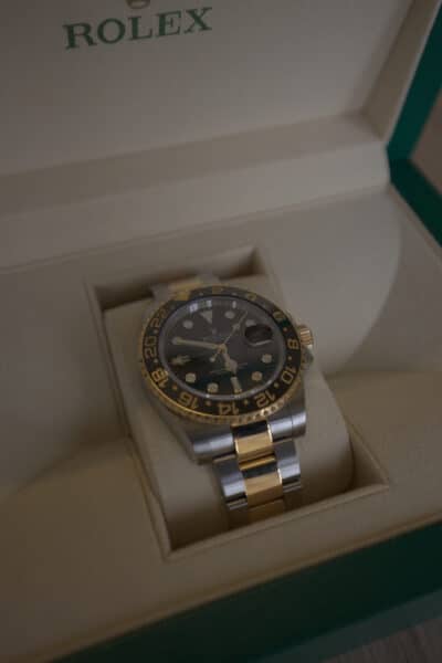 Complete with box and papers this immaculate example is a show stopper! Originally an aviation watch to help manage different time zones, the GMT Master II has since become a highly sought-after icon!